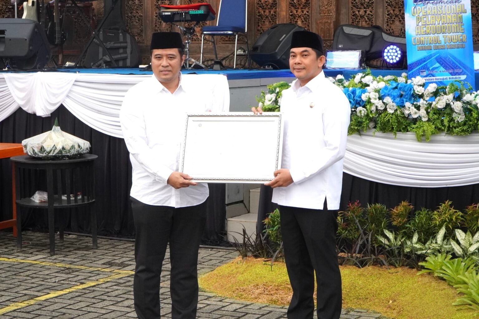 Direktur Utama AirNav Indonesia,Capt. Arivianto Suratno menyerahkan secara langsung Sertifikat CASR 172 kepada Bupati Tanah Bumbu Andi Rudi Latif,dalam tasyakuran di kawasan Bandara Internasional Bersujud Batulicin, Senin (9/3/26).