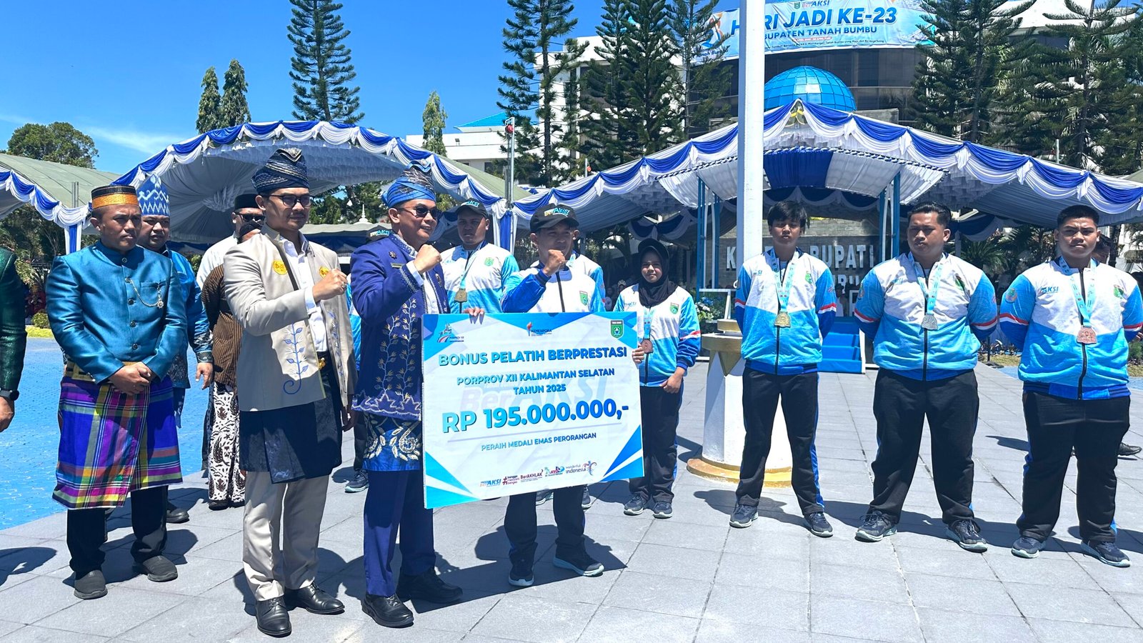Penyerahan bonus dilaksanakan dalam momen upacara Hari Jadi (Harjad)Tanah Bumbu ke -23 tahun 2026 di halaman Kantor Bupati Tanah Bumbu, Rabu (8/24/26).