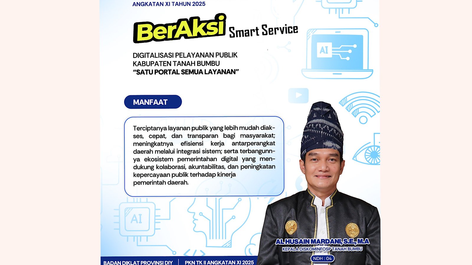 “Melihat berbagai kondisi saat ini, mulai dari banyaknya layanan publik tersebar diberbagai aplikasi yang tidak terintegrasi, lemahnya arsitektur SPBE dan system interoperabilitas antar aplikasi, rendahnya literasi digital ASN dan masyarakat, serta minimnya monitoring dan pelaporan layanan digital secara real-time. Sehingga diperlukanlah Inovasi Satu Portal Semua Layanan,” ucap Al Husain, Jumat (8/8/2025) di Batulicin.