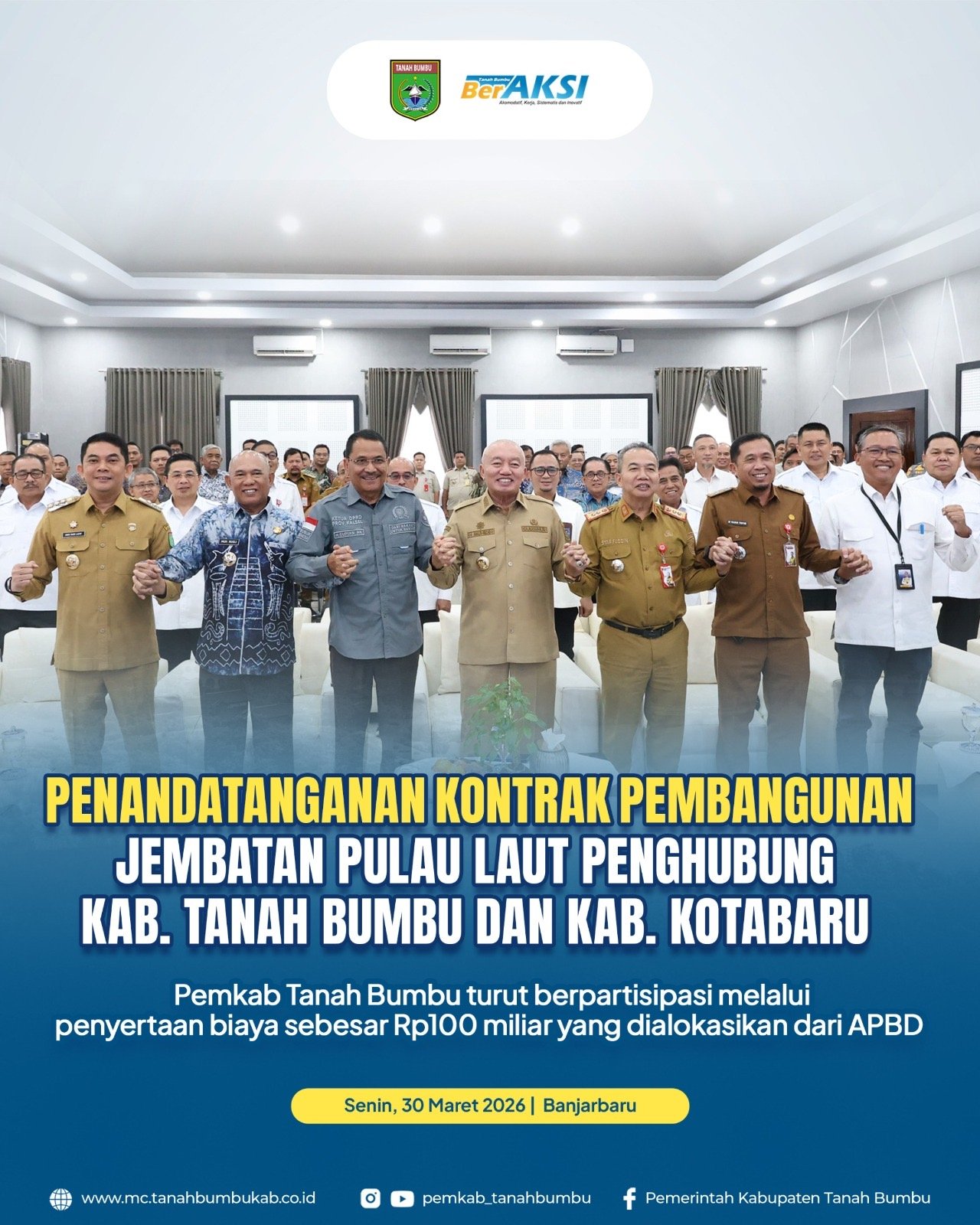 BATULICIN – Bupati Tanah Bumbu, Andi Rudi Latif, menghadiri sekaligus menyaksikan penandatanganan kontrak pembangunan Jembatan Pulau Laut yang menghubungkan Kabupaten Tanah Bumbu dan Kabupaten Kotabaru, Senin, (30/3/2026) di Banjarbaru.