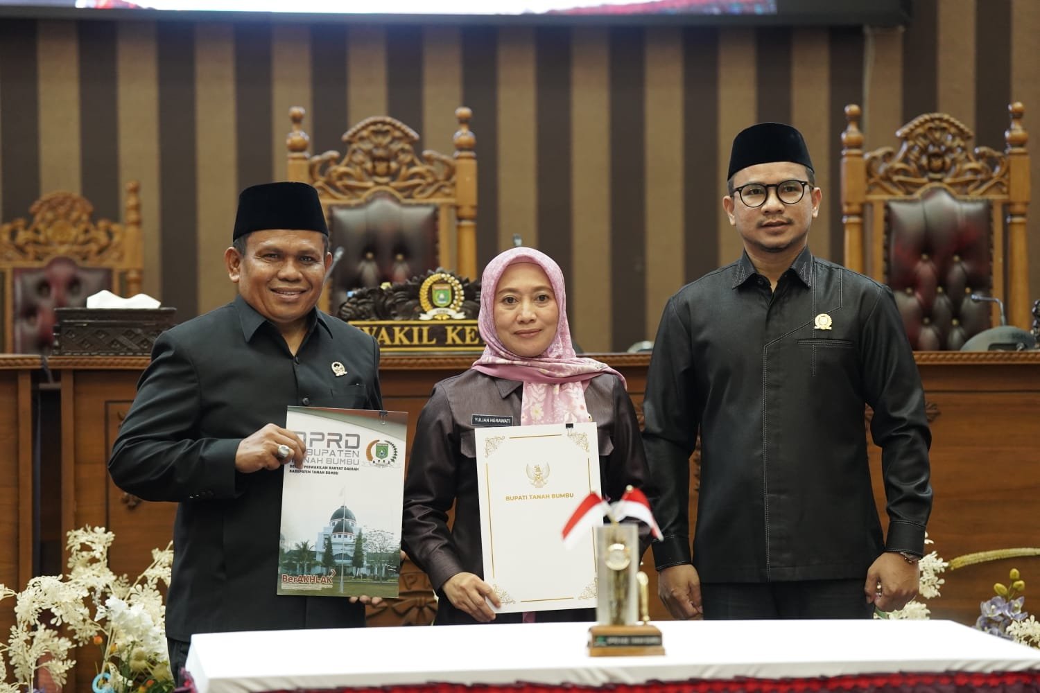 Penandatanganan dilakukan oleh pimpinan DPRD bersama bupati Andi Rudi Latif melalui Pj. Sekda Yulian Herawati, di Ruang Rapat Paripurna DPRD Tanbu, Selasa (8/7/2025).